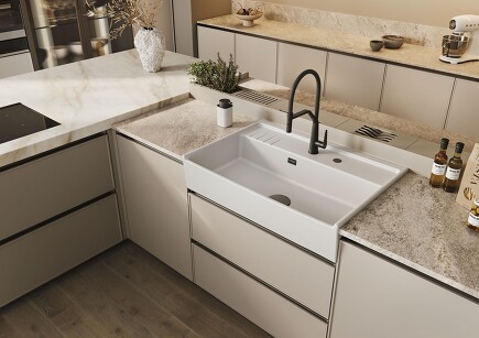Ob moderner Country-Look, klassische Landhausküche oder urbanes Loftambiente – die neue KENTRO 90 von Systemceram setzt in jeder Umgebung ein ausdrucksstarkes Statement. Mit einer Gesamtbreite von 90 cm und einem großzügigen Beckenmaß von 86 x 41,5 cm bietet sie besonders viel Platz und Komfort im Küchenalltag. Damit eignet sie sich nicht nur für ambitionierte Hobbyköche, sondern auch als semi-professionelles Vorbereitungs- und Spülcenter.