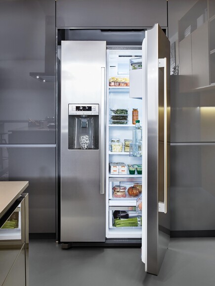 Side-by-Side-Kühlschränke bestehen aus zwei Hälften, sind im Grunde zwei separate Geräte im gleichen Format: Kühlschrank und Gefrierschrank stehen nebeneinander mit jeweils einer langen schmalen Tür – einmal mit Tür-Anschlag links, einmal rechts.